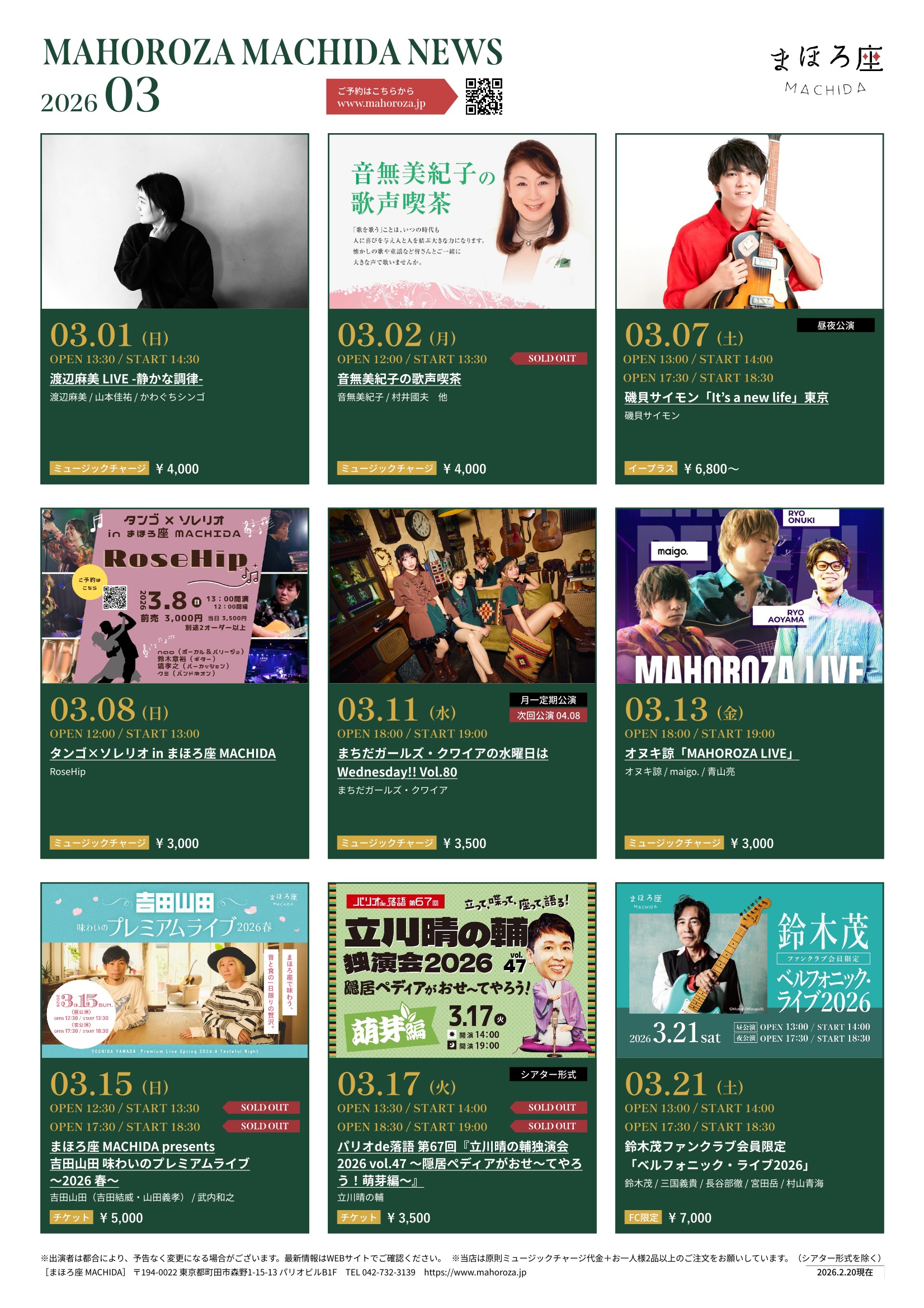 2026年3月のまほろ座 MACHIDAの公演スケジュールを公開しました。