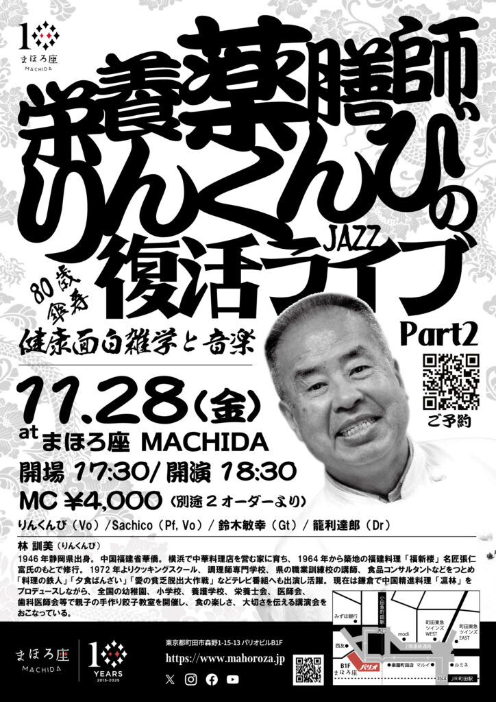中華料理の名匠として数々のメディアに出演し、現在も全国で食育や料理指導を続ける 林 訓美(りん くんび)先生。料理人として輝かしい経歴を持つ一方、歌声にも確かな魅力を宿し、長年にわたりJAZZライブを重ねてきました。