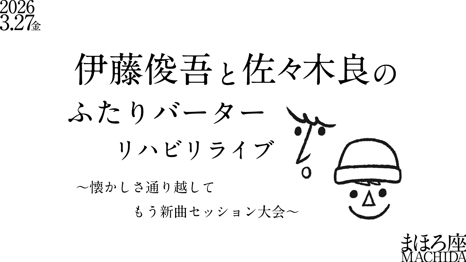 | イベント名 | 伊藤俊吾と佐々木良の ふたりバーターリハビリライブ 〜懐かしさ通り越してもう新曲セッション大会〜 |