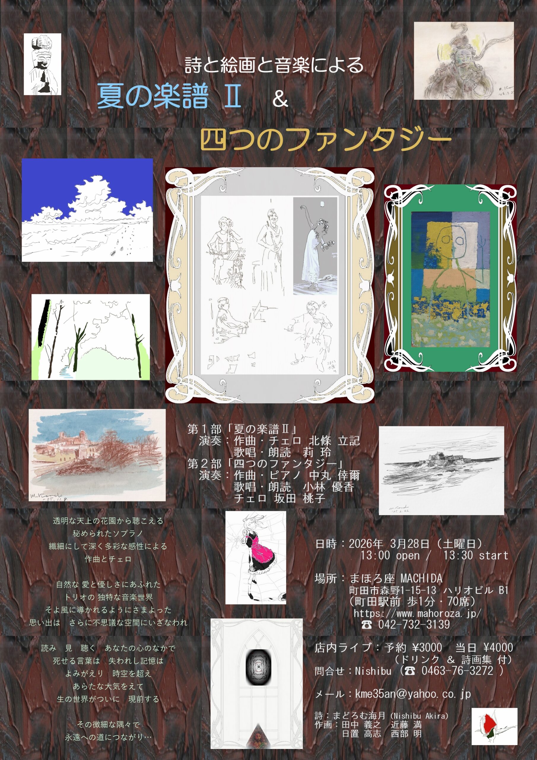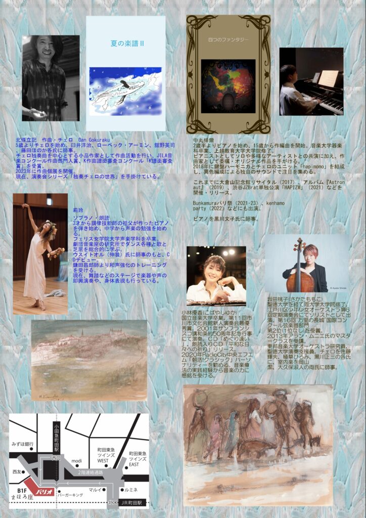 | 出演 | 第1部『夏の楽譜Ⅱ』 ・作曲&チェロ:北條立記 ・歌唱&朗読:莉玲 ・作画:田中義之 & 近藤満 & Nishibu ・詩:まどろむ海月 第2部『四つのファンタジー』 ・作曲&ピアノ:中丸倖爾 ・歌唱&朗読&フルート:小林優香 ・チェロ:坂田桃子 ・作画:近藤満 & Hioki Takashi & Nishibu ・散文詩:まどろむ海月 |