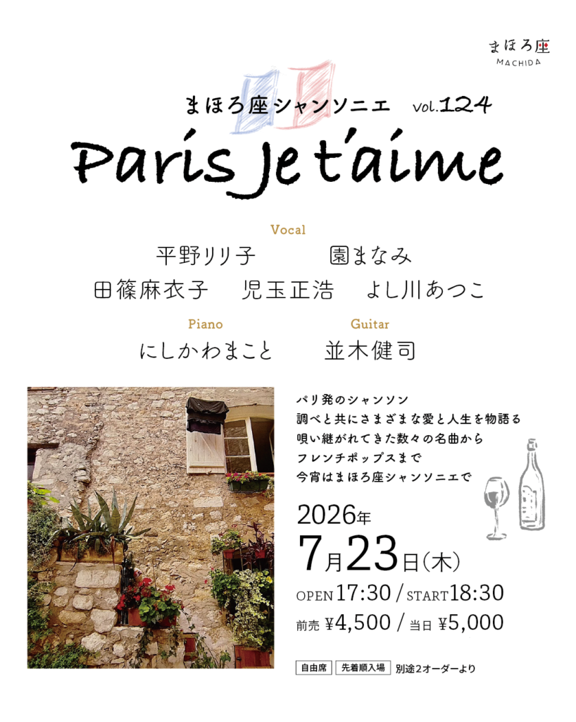 OPEN 17:30 / START 18:30まほろ座シャンソニエ ~Paris ♪ Je t’aime~ vol.97月一定期公演¥4,000¥4,000